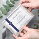The matter paper is our sample of choice -- it's a reasonably priced, good quality, nice feeling paper stock. We were a little concerned the muted rustic blues might not reproduce all that well (usually by light colored samples), but they're just gorgeous! The white lettering is perfect in combination with the blue background, and the typography is all easy to read.
