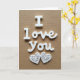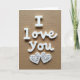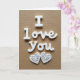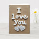 This card shows the words “I Love You” in raised white letters on a warm brown, fabric-like background. The “I” is a simple upright letter, while “Love You” is written in a smooth, flowing letter style that feels gentle and romantic. The message sits near the top center of the card, so it’s the first thing you notice. Beneath the words are two white hearts placed side by side, matching each other like a pair. Each heart has delicate cutout swirls inside, and the soft light creates small shadows that make the details stand out. The brown background looks like woven cloth, which adds warmth and makes the white letters and hearts feel even more special. It’s a meaningful card to give because it keeps the message simple and clear, but the careful details still show real care 🥰❤️.