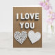 This card shows the words “I LOVE YOU” across the top in raised white letters that stand out against a textured brown fabric background. The letters look slightly three-dimensional, with small shadows that add depth. The backdrop feels like coarse woven cloth, giving the whole scene a cozy, down-to-earth setting. Under the message sit two white hearts side by side, balanced neatly in the center. Each heart has delicate cut-out details that look a bit like lace or curling leaves, which makes them feel special and carefully made. The simple white shapes against the earthy brown background keep the focus on love and closeness ❤️. It feels meaningful to give because it says what you mean clearly, while the gentle details show you really thought about it 🥰.