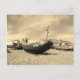 Sepiatone image of a classic, clinker built, wooden fishing boat.