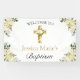 Welcome your guests to your baby's baptism with this beautiful white floral gold cross baby baptism welcome banner. This banner for baptism features a simple white background with white roses and botanical accents in each corner. An elegant gold cross with white roses is featured as the centerpiece. Personalize with your child's name underneath the golden cross. Perfect for either a baby boy baptism or a baby girl baptism.