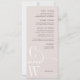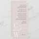 Elegant monogram menus for your wedding or rehearsal dinner feature your initials at the lower left, joined by an ornate swooping "and," on a pale grayed blush background.