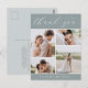 Elegant wedding thank you postcards feature four photos arranged in a grid collage layout on a dusty sage green background. "Thank You" appears at the top in chic calligraphy script, with your names along the bottom in classic block lettering. Add a personal message and signature to the color-coordinated back.