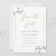 Branches of white orchids, hand-drawn in graphite pencil, decorate this simple but sophisticated, elegant yet chic wedding save the date that features a delicate gold frame. The hint of gold in the color of the writing gives this a festive but subdued splash of color.