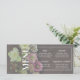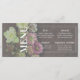 Menu card featuring live spring blooms in moody and muted tones against a dark walnut wood backdrop. Simple whit text lets your guest know what is in store.