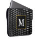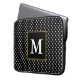 A large white monogram is a on black square with a faux gold border. White polka dots are on this black laptop sleeve.