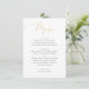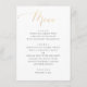 Present your dinner selections in elegant simplicity with this formal wedding menu card. Featuring luxurious gold style script and classic serif text on a white background, it displays your courses in a refined layout. The printed gold effect provides the look of metallic sophistication without foil printing. Fully customizable to match your menu details. Perfect for modern, minimalist, or upscale celebrations.