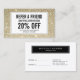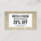 A stylish and simple salon referral card featuring a faux gold glitter background. Update the promotion text for your desired offering. Generate more sales and visits by encouraging your customers to refer their friends for a discounted service or free product. Great for beauty salons, makeup artists, boutiques, hairstylists, cosmetologists and more. © 1201AM CREATIVE