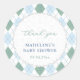 Classic blue and green argyle print favor sticker design for a golf-theme baby shower to welcome a little boy, featuring a golf ball with text overlay. All artwork was created by me.