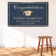 Classic dark blue graduation party welcome banner featuring a gold grad cap, "Congratulations" in an elegant calligraphy script and the graduate's name, school and class year in modern serif typography.