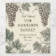 This vintage wine label template features an etched, hand-drawn illustration of lush grapevines, leaves, and grape clusters. The monochrome green-grey palette and detailed linework give the design a traditional, classic winery aesthetic.