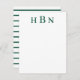 Timeless and elegant custom flat note card design features deep hunter green letters that can be personalized with the first, last, and middle name initials in classic serif type. Space for your handwritten note is included and the back of the card features a handsome pattern of horizontal green and white stripes.