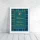 A preppy, classic baby shower welcome sign poster with equestrian and plaid elements in navy and hunter green with gold tone accents. A family name crest with monogram and polo player silhouette with horse adorns the top and the tartan pattern adds a timeless touch. Perfect for an Old Money themed baby shower with a classic, vintage and luxurious feel. If you like grandpa core, vintage style this is a great baby shower theme. Customize this editable baby shower welcome sign poster template with your own event details. Place it in your favorite frame and display at your baby shower.