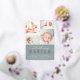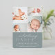 Elegant birth announcements feature four newborn photos arranged in a grid collage layout on a dusty sage green background. "Introducing [name]" appears beneath in chic calligraphy script and foil block lettering. Personalize with baby's full name, birth stats, and a family signature at the bottom. A simple and clean gender neutral design for announcing your little one's arrival.