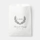 Custom-designed wedding favor bags featuring classic style laurel wreath monogram design with couple's initial, name, and wedding date