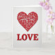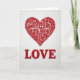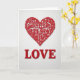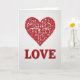 This card shows a large red heart near the top and the word “LOVE” underneath it. The heart is made from many tiny red squares, like a stitched pattern laid out on a white fabric background with faint grid lines. Inside the heart, the little squares form a maze-like design that feels detailed and thoughtful, not just a simple shape. Below, “LOVE” appears in thick red letters that look like they’re sewn with thread, and each letter has a slight raised look. Soft light from above creates gentle shadows under the heart and the letters, so the design feels warm and real. The strong red-on-white contrast makes the message easy to read and instantly romantic ❤️. It’s a meaningful card to give because it suggests care and time put into love, whether for a partner or a close friend 🥰.