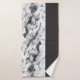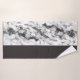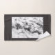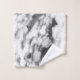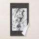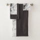 The bath towel has a strip of dark smoke grey down the right side and a beautiful black,grey and white marble pattern on the left side. The hand towel has the marble pattern in the middle and a frame of dark smoke grey and the wash cloth is all marble. A beautiful set.