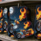 A stunning hot rod motorcycle cruises a dark road, its fiery details glowing against the tranquil beauty of moonlight and trees.
