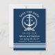 Bold and nautical, this no-photo save the date features a striking white anchor and rope wreath monogram crest with personalized initials on a deep navy background, with a white stripe footer and the playful "tying the knot" script. A confident, graphic choice for coastal, seaside, or destination weddings. All text and monogram initials are fully customizable.
