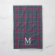 Personalized kitchen towel for the holiday season featuring classic style navy blue and red Christmas plaid pattern with custom initial and name.