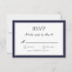Navy blue and grey border RSVP response card. Block and elegant script text. Navy blue back.
