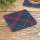 Festive holiday drink coaster design features a classic navy blue, hunter green, and red Scottish tartan plaid pattern made modern on a diagonal.