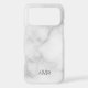 Classic design features personalized 3 letter initial monogram in grey classic serif font style on white marble background.