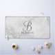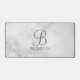 features personalized monogram in grey classic script font style and name in grey classic serif font style on white marble background.
