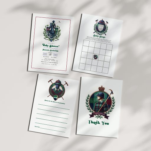 Seal your baby shower invitations with a touch of timeless sophistication using this Classic Preppy Charm monogram sticker. Featuring a distinguished equestrian crest with a regal rider, crossed mallets, and a personalized monogram shield, this seal is the perfect finishing touch to your polo-inspired stationery. The deep hunter green, navy, and burgundy tartan accents give it a traditional, upscale feel. Whether for invitations, thank-you notes, or party favors, this luxurious envelope seal ties your preppy celebration together with style.
