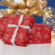 This fun Christmas wrapping paper features a festive novelty white print of snowmen, snowflakes, presents and ski hats against a classic red background.