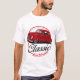 This is a rendering of an American classic street rod car with red vintage graphics in the background for a retro styled look.
