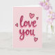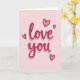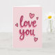 This card shows a blush-pink background with the words “love you” as the main focus. The text is set on two lines, with “love” above “you,” in smooth, flowing letters that feel like a quick note from the heart ❤️. The letters are deep fuchsia with a darker outline, and there’s a soft, lighter pink shadow behind them that adds a gentle sense of depth. Around the words, several small hearts in matching pink tones are scattered, like they’re floating nearby. Everything stays simple and easy to take in, but it still feels romantic and close. It’s the kind of card that says what you mean without needing a long message, which can make it especially meaningful to give 🥰. Share it to pass along a little Valentine’s Day love and let someone know they matter.