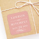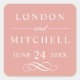 Charming wedding favor stickers featuring the couple's names in elegant typography with the wedding date on a soft rose gold pink background with a decorative border. The refined square monogram design pairs beautifully with kraft favor boxes, gift bags, or envelopes at your wedding event. All text is fully customizable.