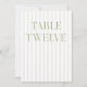This elegant table number features a soft beige striped background with refined sage green serif typography and subtle script accents. Designed for garden weddings, refined receptions, and timeless outdoor celebrations.