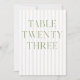 This elegant table number features a soft beige striped background with refined sage green serif typography and subtle script accents. Designed for garden weddings, refined receptions, and timeless outdoor celebrations.