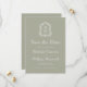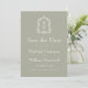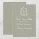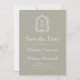 This elegant vintage-inspired wedding Save the Date design features a pair of white monogram initials in open serif font above and below a dividing line and encircled by a line art acanthus crest on a sage green background. The back of the card is solid sage green.