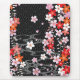 The Cherry blossoms in pink, red, white and orange shades. The background is gray traditional Japanese patterns on black. This is a digital illustration.