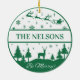 This fun green and white Christmas ornament will be a family keepsake for years to come. The classic design features Santa and his reindeer flying through the night over a deer surrounded by pine trees with the words "Be Merry". Personalize by adding your family name or special text.