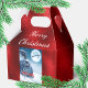 Trains, Christmas and children seem to go together. Along with the festive look of red foil. In this design, the jolly old elf and his reindeer streak across the full moon in the upper right of a front and back insert in this deeply red foil favor box. Santa and crew are silhouetted in black (and only 6 reindeer, but don't tell the kids). On the left, a huge black steam engine with touches of red billows black smoke into the cold snowy night. The foil-look is a deep, deep red and surrounds front and back pictures. "Merry Christmas" is in a light fun script font - in white - across the flaps. Perfect for children of all ages as well as train aficionados (of all ages). If you prefer "Happy Holidays", another greeting, or none at all, the text is easily changed or deleted. Just hit "Personalize".