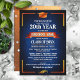 Great class reunion invitations in your school colors of blue and orange, that you personalize with all your celebration details for your big reunion event. This design features a rich background with gold corner accents and a gold graduation cap & tassle bordering the event details. Your school name is prominently featured on a gold banner right in the center.