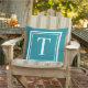 A classic outdoor pillow featuring a bold white monogram initial inside a square frame border on a rich teal background. The timeless serif letter and clean geometric frame deliver a sophisticated, coastal accent for patio furniture, pool decks, or porch seating. The initial is fully customizable.