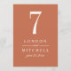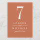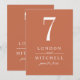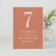 A warm terracotta background and bold white serif typography bring earthy, modern elegance to this wedding table number card. The couple's names and wedding date are displayed in a clean typographic layout for a sophisticated monogram centerpiece. The couple's names, date, and table number are easy to personalize. Each table number must be individually personalized and added to the cart one at a time.