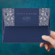 The grandeur of a bygone era comes to life with this classic Victorian-inspired wedding envelope. A majestic navy blue base sets the stage for the cream botanical and floral artwork that graces both the front and back flaps. Two elegant lovebirds, perched amidst the foliage and marked with monograms, bring a personal touch to this timeless design. The front of the envelope features a clean and sophisticated space for the recipient's address, complemented by the exquisite pattern that lines the sides. Whether it's the initial impression or the last detail your guests see, this wedding envelope promises to deliver your special news with heritage charm and an air of sophistication.