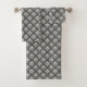 A towel set and washcloth feature a classic white floral damask pattern on a dark gray background. The bathroom accessories convey a sophisticated and elegant tone.