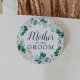 This classic white flowers mother of the groom button is perfect for a spring wedding shower. The elegant floral design features soft ivory and white roses, peonies, and chrysanthemum with touches of periwinkle blue watercolor flowers and green foliage.