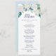 This classic white flowers wedding dinner menu card is perfect for a spring wedding. The elegant floral design features soft ivory and white roses, peonies, and chrysanthemum with touches of periwinkle blue watercolor flowers and green foliage. This menu can be used for a wedding reception, rehearsal dinner, or any event.