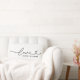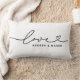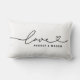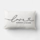 A classic lumbar pillow featuring Love in flowing black heart script with customizable couple names on a white background. The clean black-on-white design creates a crisp, timeless wedding gift, anniversary keepsake, or versatile home accent. All text is fully editable to personalize with any couple's names.