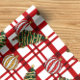 Combination of red sparkles, Christmas tree plaid and "falalala" script in a seamless pattern creating a classic holiday wrapping paper design.