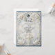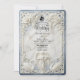Set a tone of grand elegance for your estate wedding with this design featuring a faux bas-relief Baroque arch, musical angels, and a romantic blue palette.This design features a highly detailed, printed simulation of classical architectural carving. A central archway, rendered in the style of 3D white plaster, frames the text details against a faux dusty blue background. The artwork includes intricate bas-relief effects of blooming white roses, acanthus scrollwork, and two swans at the base. At the top of the column, a cherub angel playing a violin adds a touch of movement. The typography blends an ornate calligraphy script with a traditional serif font in dark charcoal grey for readability.This is a flat printed image with a faux stone texture effect, not actual raised material or embossed paper.