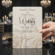 Evoke the grandeur of a traditional church wedding with this faux bas-relief design, featuring a romantic sculpted illustration in monochrome cream tones.This design features a sophisticated trompe l'oeil visual technique simulating the look of hand-carved sandstone or plaster. The central illustration depicts a winding cobblestone path leading toward a domed chapel on rolling hills, framed by a bride and groom walking away into the landscape. Lush blooming roses anchor the corners in a sculptural style, rendered in a monochromatic palette of ivory, cream, and beige to create soft, realistic shadows and highlights. The typography hierarchy utilizes an elegant calligraphy script for names, balanced by a formal serif font for the ceremony details, mimicking the precision of stone engraving.